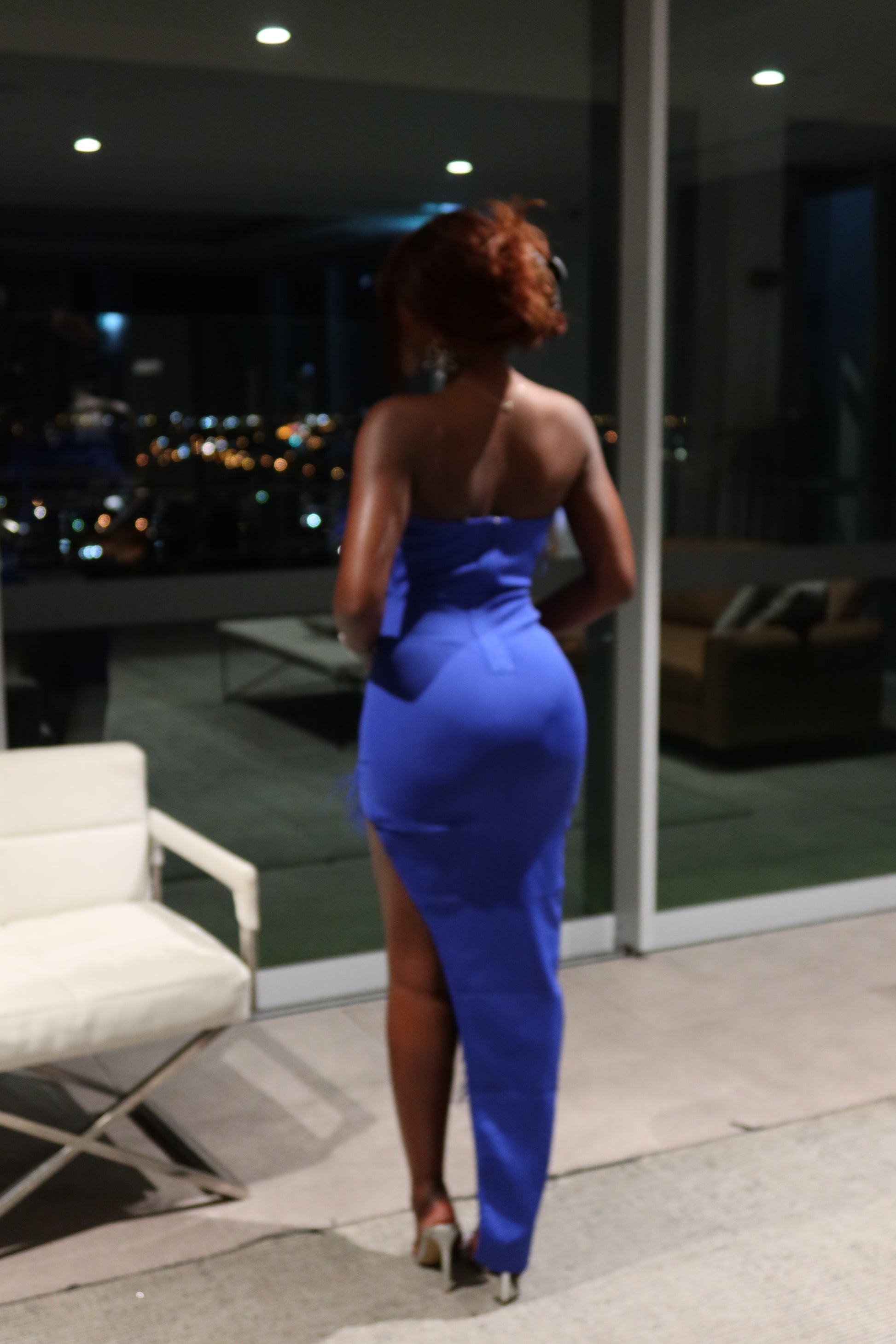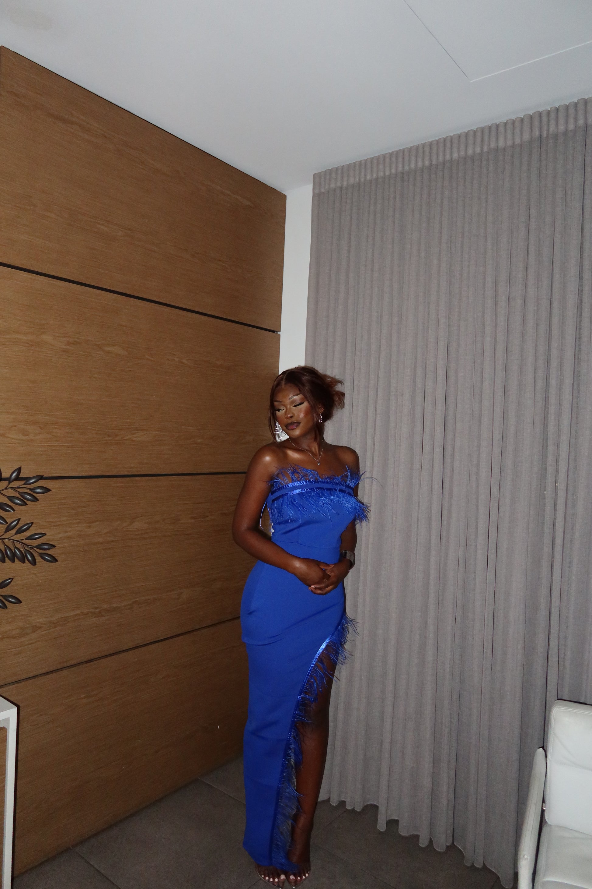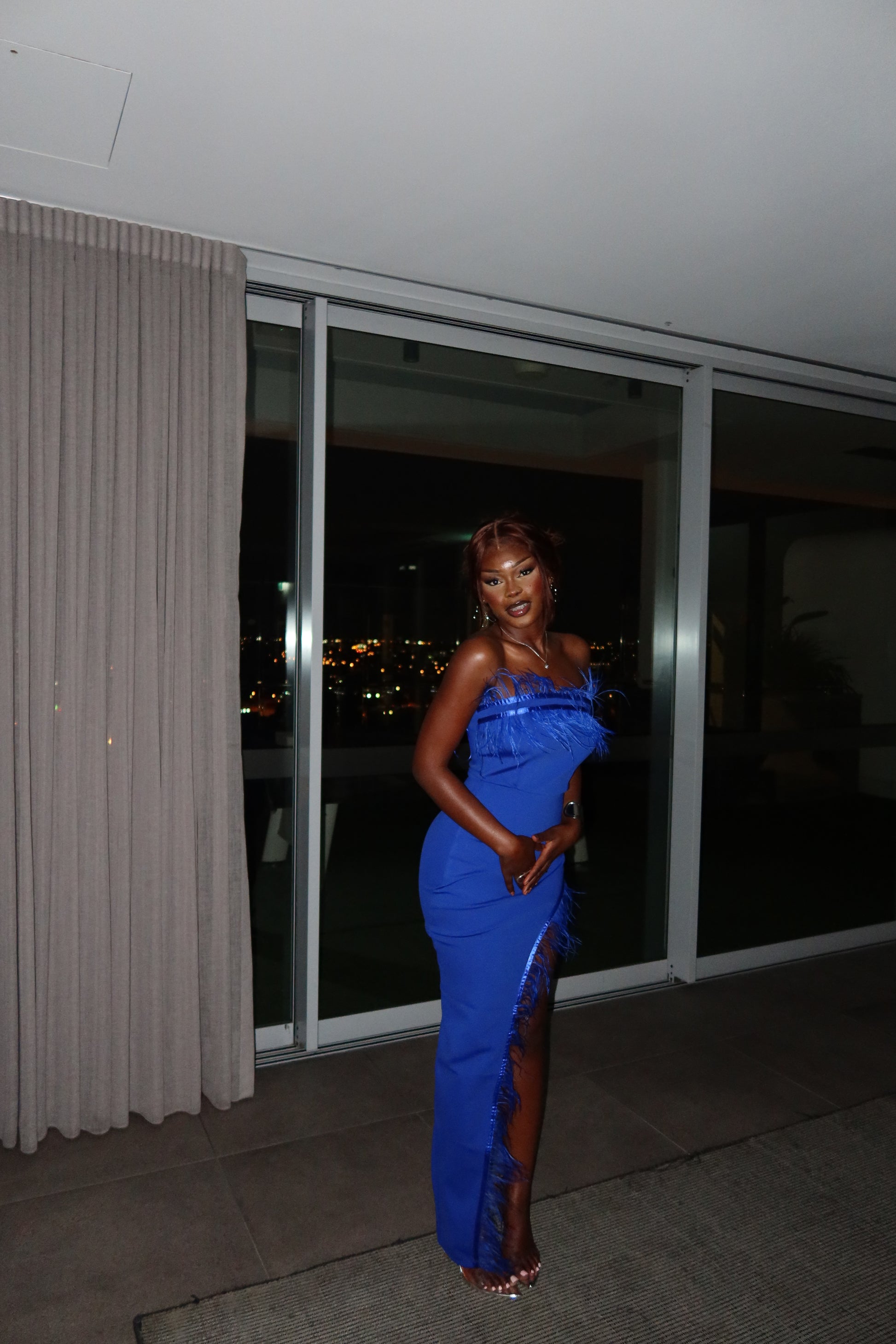 Our Aqua dress embodies the essence of elegance with its flowing feather accented silhouette and stunning royal blue colour. Featuring a high side split, this dress effortlessly combines sophistication with a touch of allure, perfect for making a statement at any special occasion.